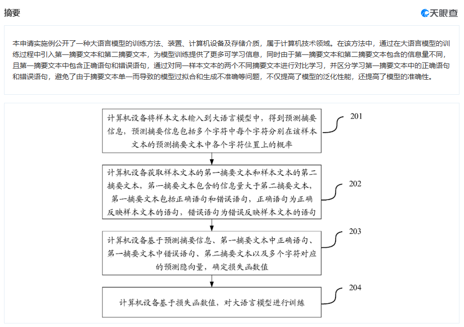 摘要显示,在该方法中,通过在大语言模型的训练过程中引入第一摘要文本和第二摘要文本,为模型训练提供了更多可学习信息,同时由于第一摘要文本和第二摘要文本包含的信息量不同,且第一摘要文本中包含正确语句和错误语句,通过对同一样本文本的两个不同摘要文本进行对比学习,并区分学习第一摘要文本中的正确语句和错误语句,避免了由于摘要文本单一而导致的模型过拟合和生成不准确等问题,不仅提高了模型的泛化性能,还提高了模型的准确性。