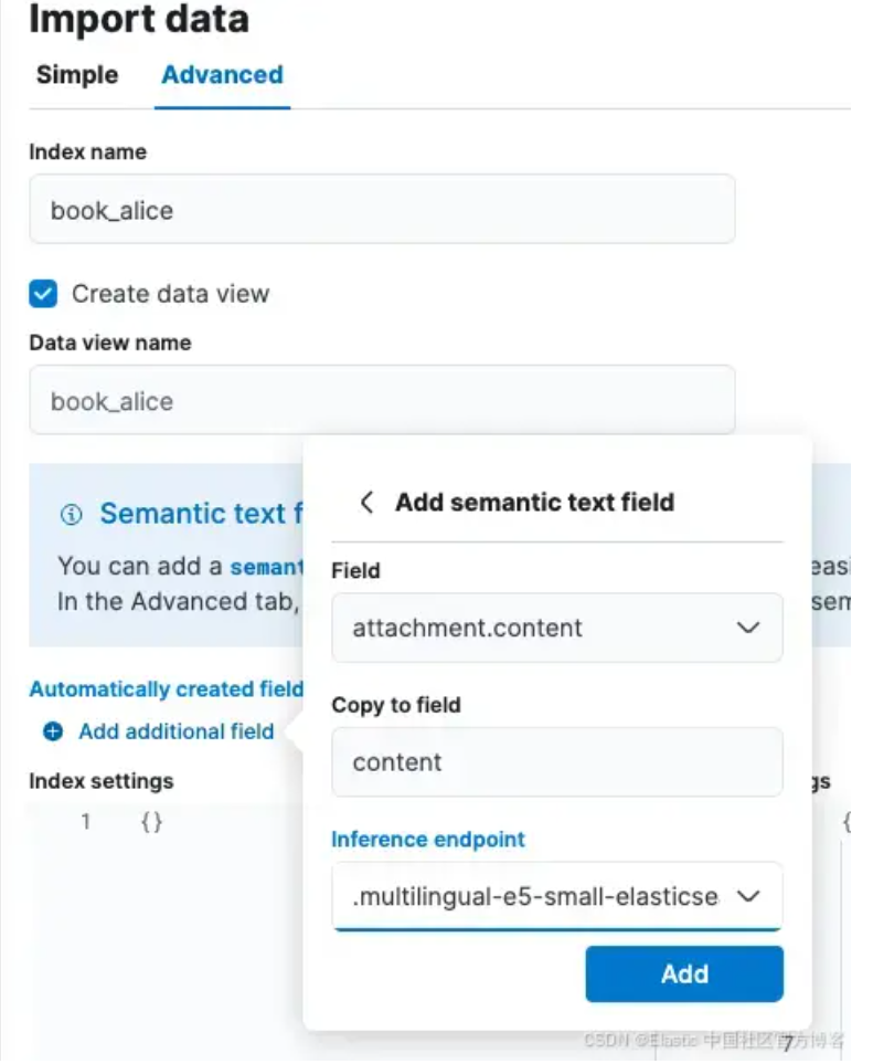 选择 Add additional field” 选项,它位于 “Automatically created fields” 正下方。选择“ Add semantic text field” 并将推理端点更改为 “.multilingual-e5-small-elasticsearch”。选择 “Add”,然后选择 “Import”。