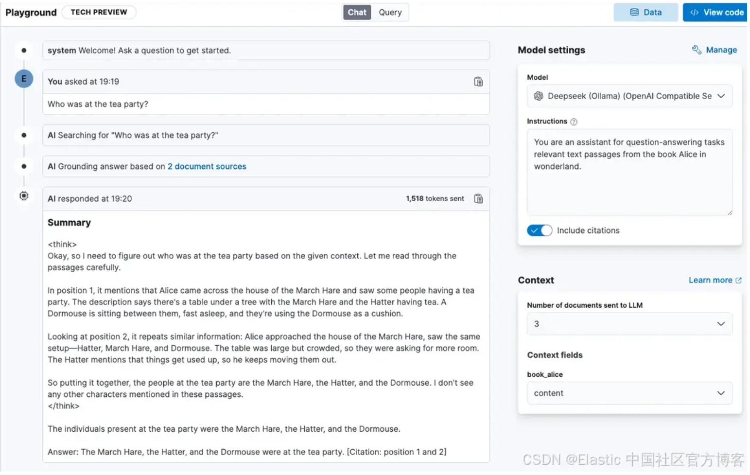 在我们的 Playground 设置中,我们输入了以下系统提示 “You are an assistant for question-answering tasks using relevant text passages from the book Alice in wonderland - 你是使用《爱丽丝梦游仙境》一书中的相关文本段落进行问答任务的助手”,并接受其他默认设置。