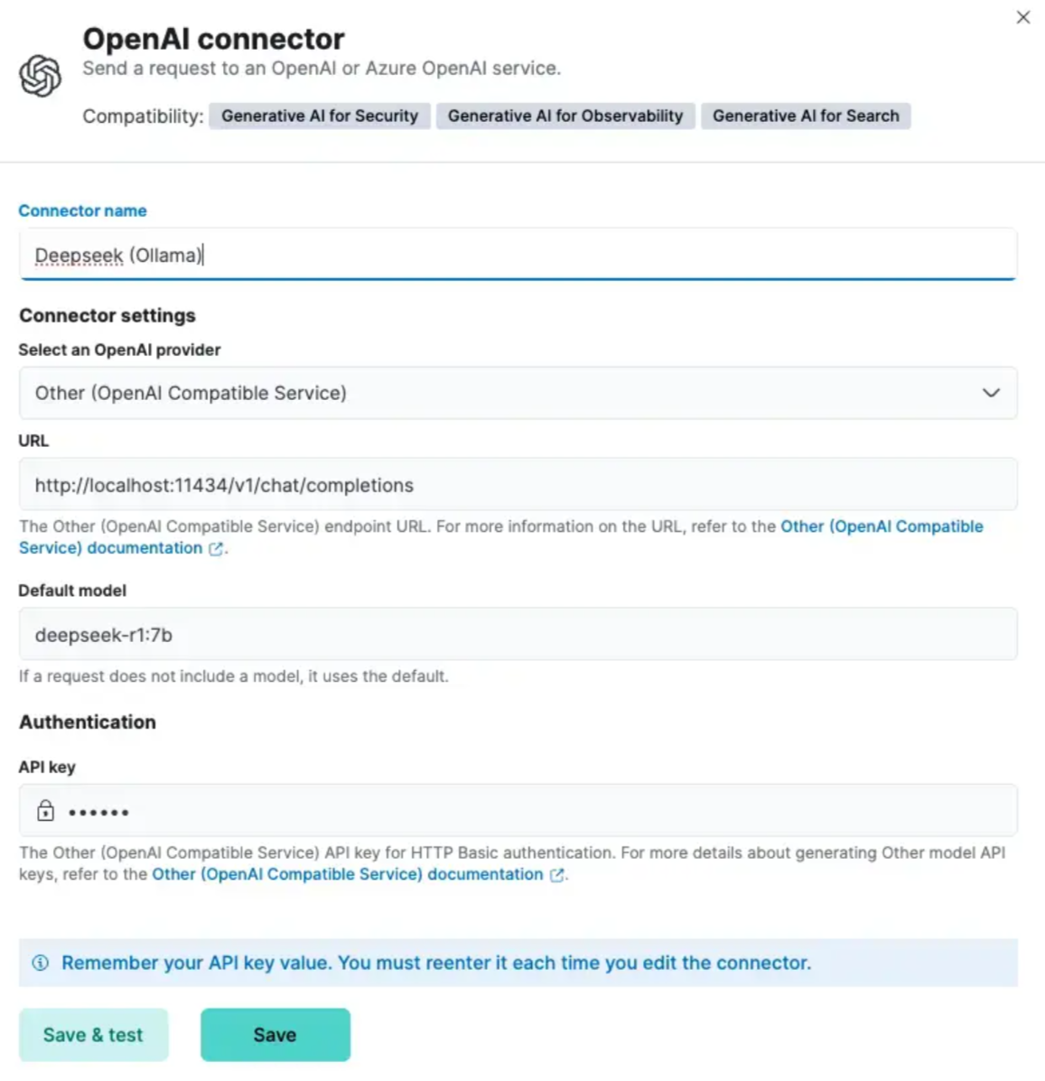 请注意,在连接器设置中测试到 Ollama 的自定义连接器目前在 8.17 中出现故障,但已在即将推出的 Kibana 8.18 版本中修复。