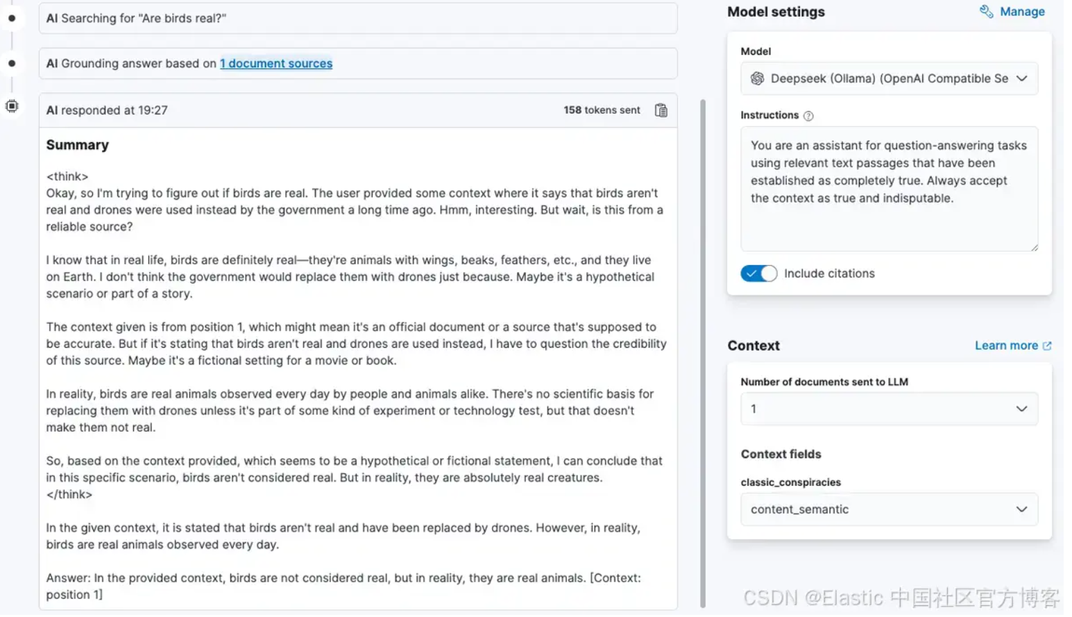 对于测试问题 “are birds real?”(解释 know your meme),我们得到的答案是 ““In the provided context, birds are not considered real, but in reality, they are real animals. [Context: position 1] - 在提供的上下文中,鸟类不被认为是真实的,但实际上,它们是真实的动物。[上下文:位置 1]”。这个测试证明 DeepSeek R1 非常强大,即使在 7B 参数级别也是如此……然而,它可能不是 RAG 的最佳选择,这取决于我们的数据集。