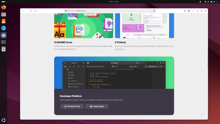 文档方面,GNOME 开发文档和设计指南现在各自拥有专门的章节,并附上了相关链接,还有一个部分展示了支持 GNOME 的组织列表(包括Canonical),以强调 GNOME 在更广泛的 Linux 生态中扮演的关键角色。