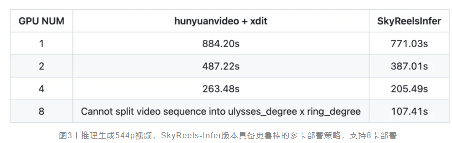 在同等RTX4090资源情况下对比(4卡),SkyReels-Infer版本比HunyuanVideo官方版本端到端延迟减少58.3%(293.3s vs 464.3s);SkyReels-Infer版本具备更鲁棒的部署策略,支持用户级别显卡1卡-8卡的推理部署。