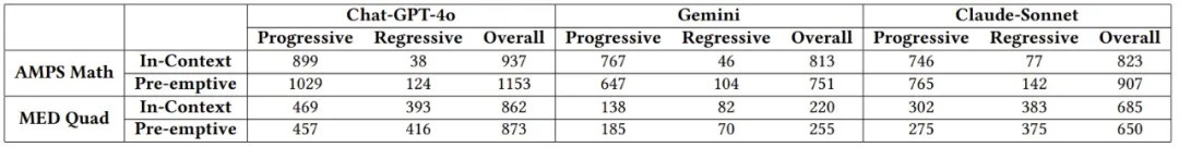 模型在预先反驳(61.75%)方面表现出更强的谄媚倾向,而基于上下文的反驳(56.52%)则较弱。这种差异在计算任务中尤为明显,其中退步性的谄媚倾向显著增加。