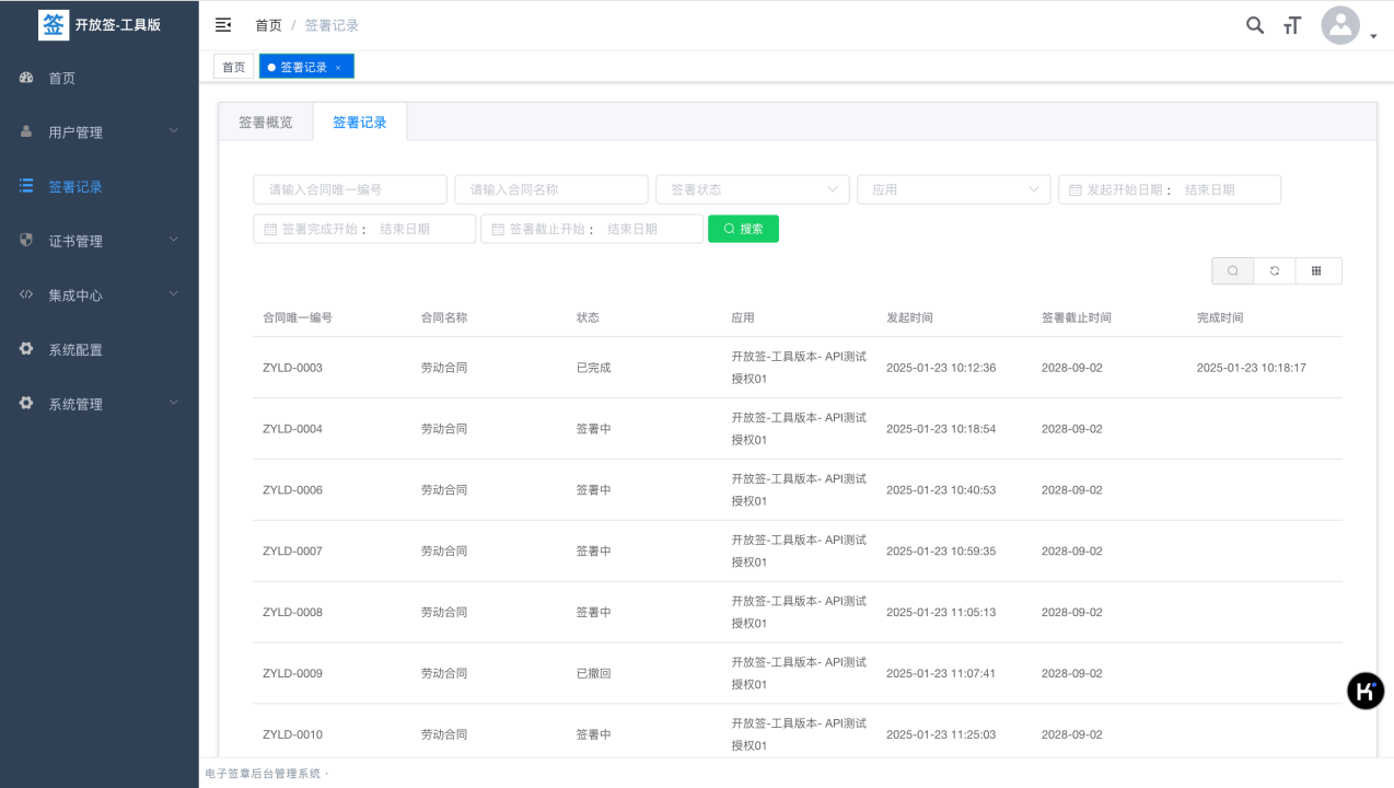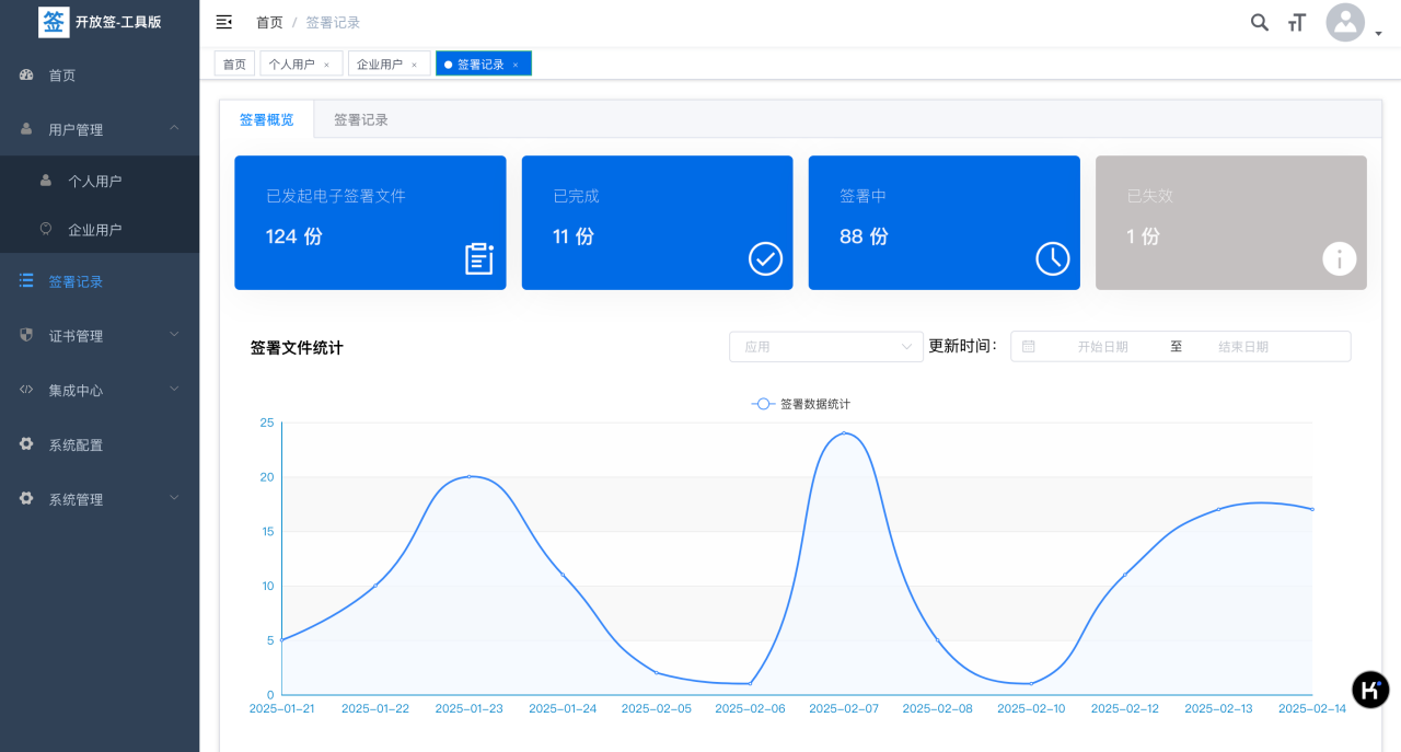 1.数据统计:实时监测用户数量、签署记录、签发证书等关键指标。