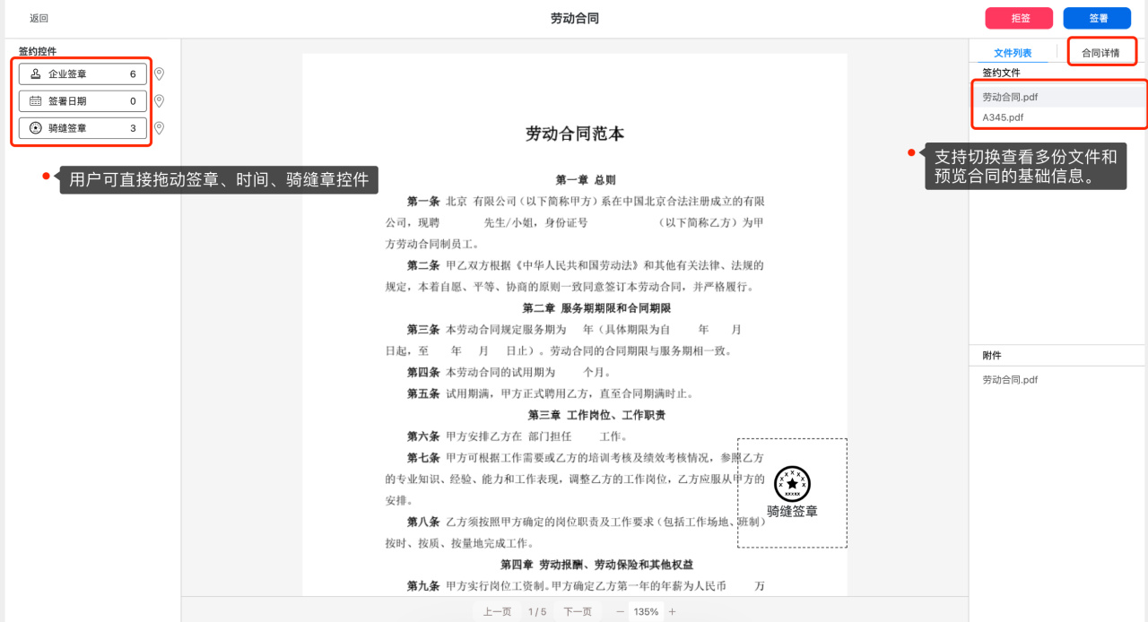 4.合同接口(8个):支持合同的发起和签署,支持自定义流程,支持关键字签署和坐标签署,额外合同接口提供一套前端签署页面(如下图)。