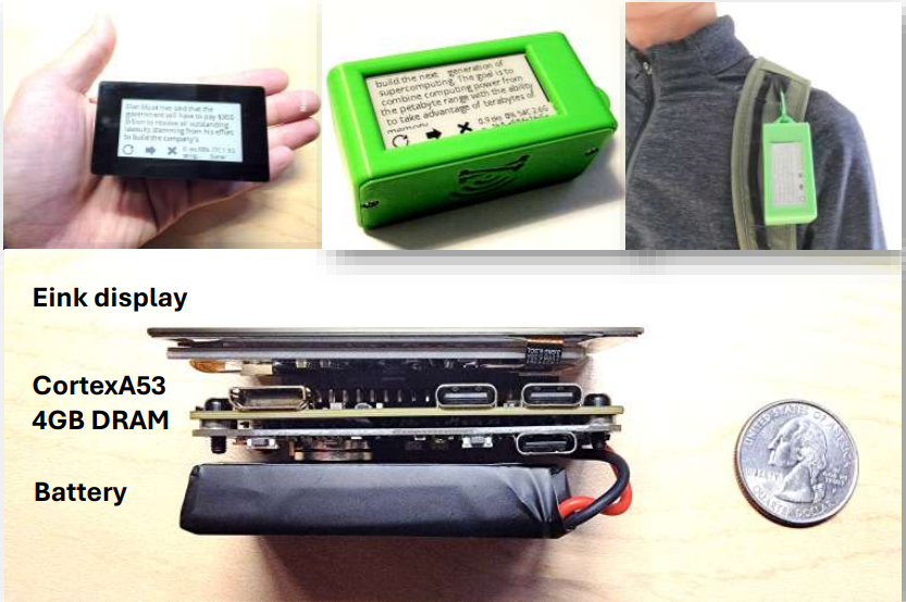 下图是论文演示在一个可穿戴设备上运行压缩后的 RWKV 模型(带可视化屏幕),开发板型号为 Orange Pi Zero 2W,板载 CPU 1.5GHz 4x Cortex-A53,内存 4GB 。
