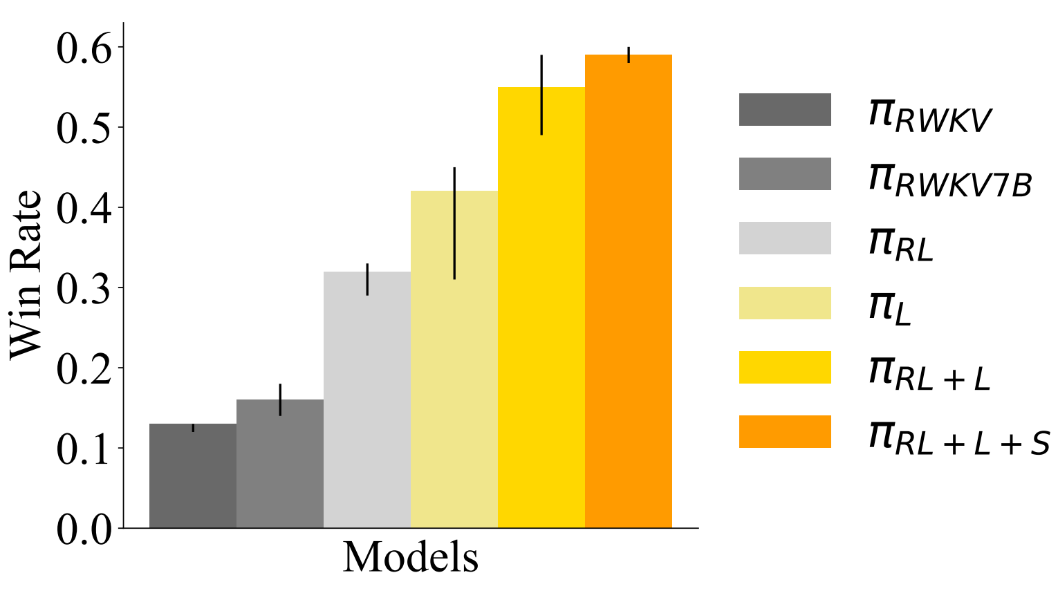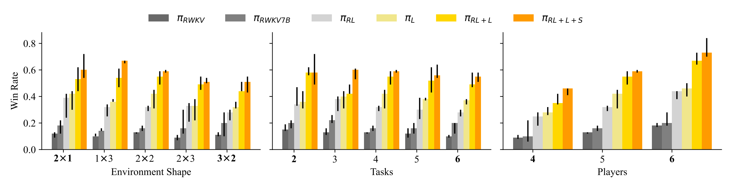 上图:不同算法训练的模型在基础环境(2 × 2 网格,每名队员 4 项任务,共 5 名玩家)中的胜率,经过完整框架训练的 RWKV 模型(橙色)胜率大幅领先传统 RL 模型(浅灰色)。