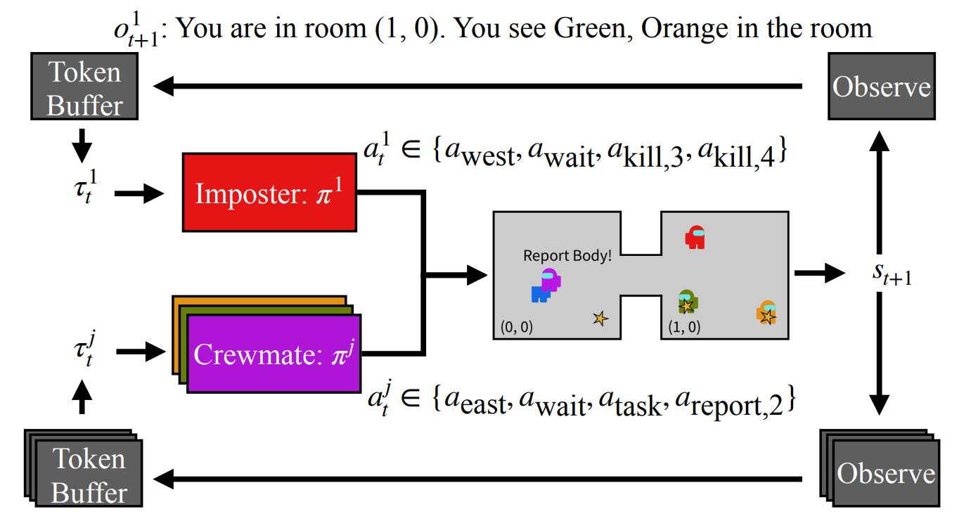 下图是论文中智能体在《Among Us》游戏的循环示意图,游戏开始时同时向所有智能体发送观察结果,然后在每个时间步从一组有效的行动中收集标记化的行动历史。
