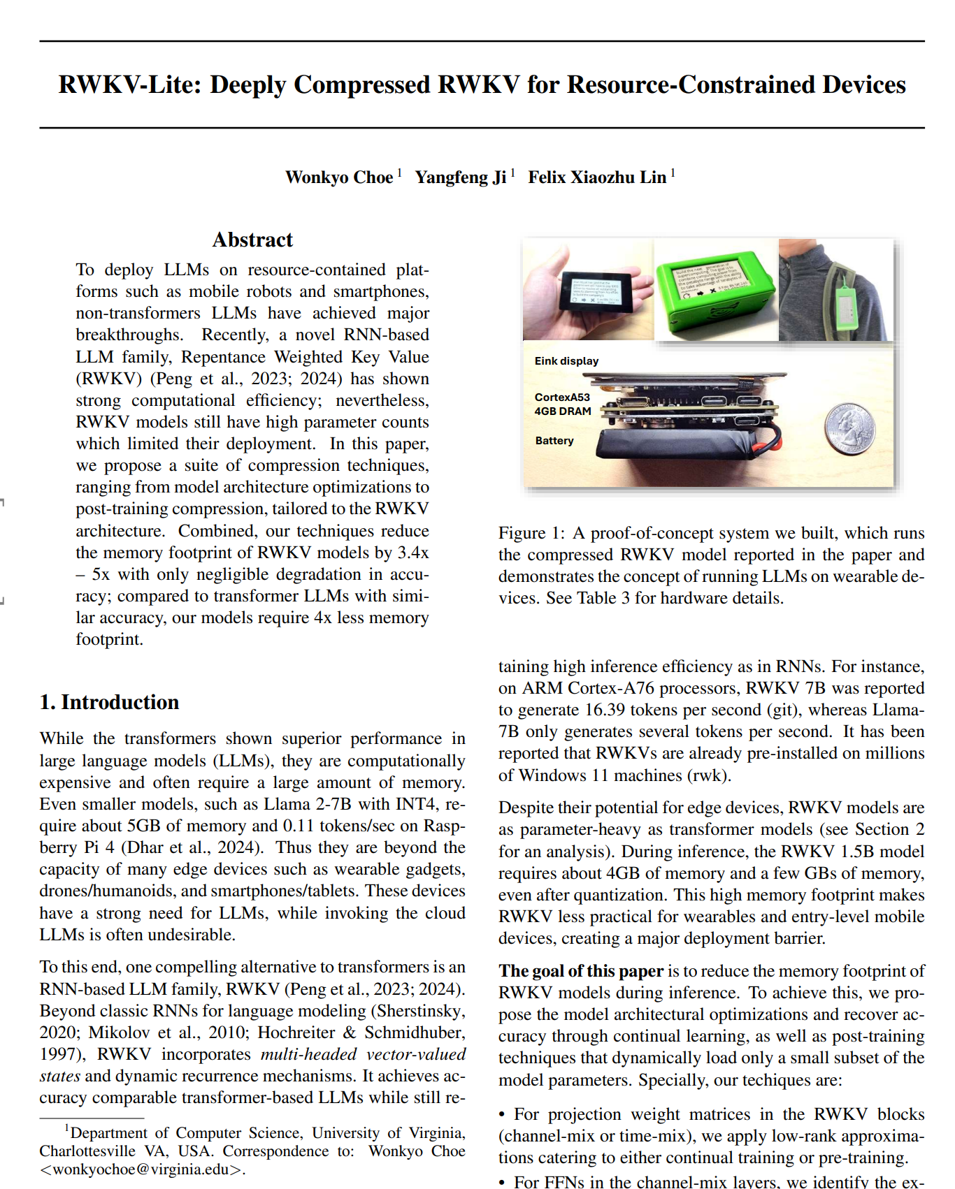 UVa(弗吉尼亚大学) 团队提出了 RWKV-Lite,一套从模型架构优化到后训练压缩的高效 RWKV 模型压缩技术。
