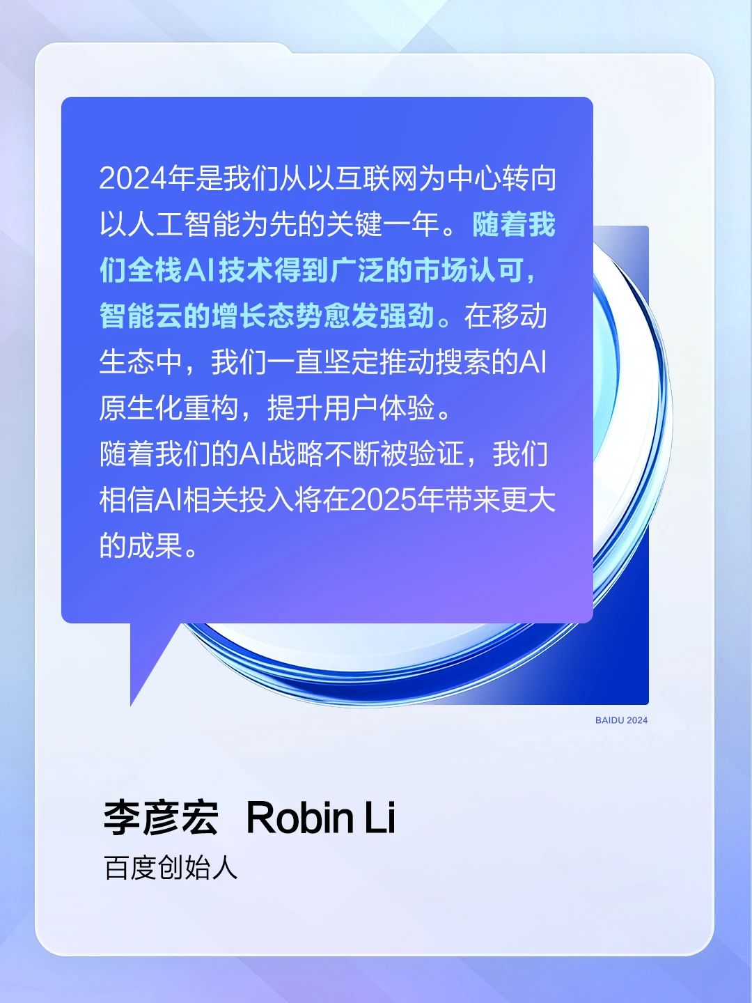 2024 年是百度从以互联网为中心向以 AI 为先转型的关键一年。我们的全栈 AI 能力得到了市场的广泛认可,从而推动了人工智能云的发展势头。在移动生态系统方面,我们坚定不移地推进 AI 转型,使搜索更接近原生 AI 能力,从而提供更好的用户体验。