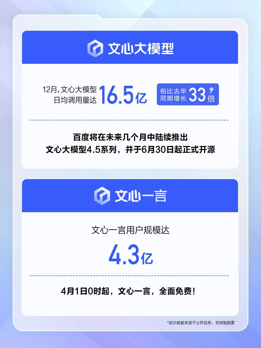 12月,文心大模型日均调用量达16.5亿次,一年增长33倍。