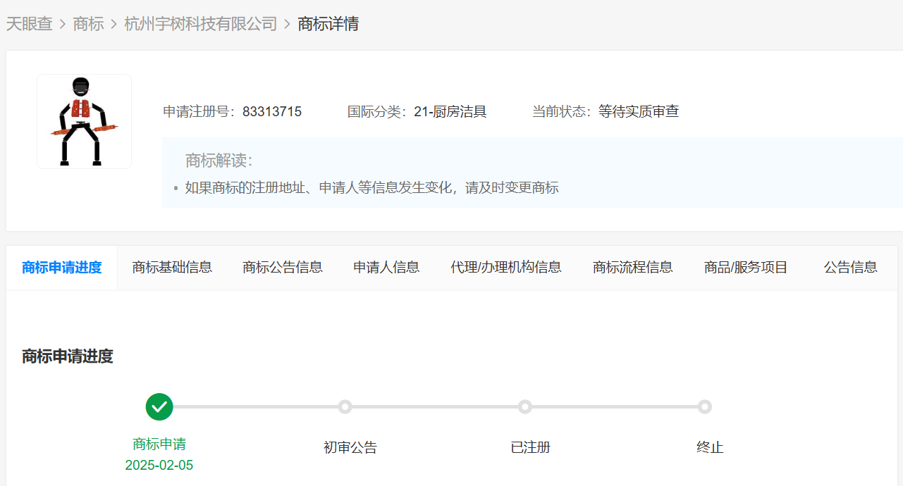 天眼查资料显示,2月5日,杭州宇树科技有限公司申请注册一枚“春晚机器人”样式图形商标,国际分类为厨房洁具,当前商标状态为等待实质审查。