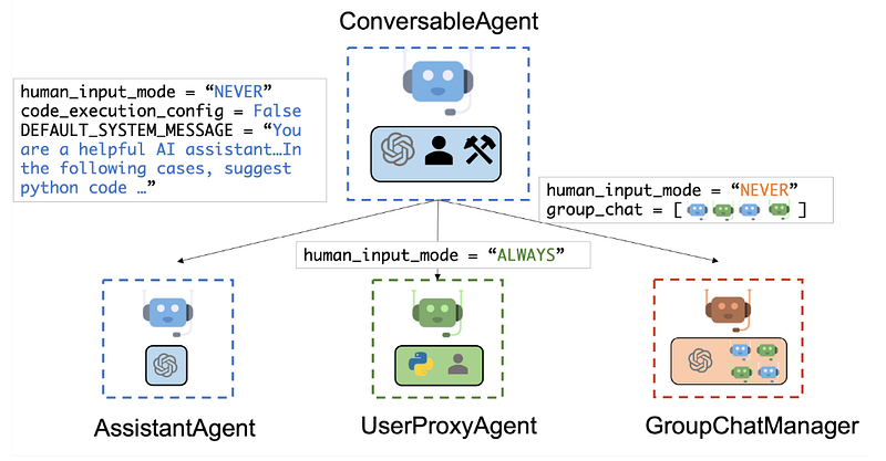 来源:微软 Autogen[2],展示了不同类型的 Agent 及其在 Autogen 库中的作用