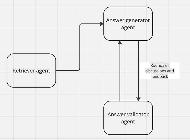 采用 Agentic 方法,基于上述情况,我们可以创建三个 Agent:一个是负责检索任务的检索器 Agent,一个是负责生成答案的答案生成器 Agent,以及一个负责对答案进行反馈的答案验证 Agent。