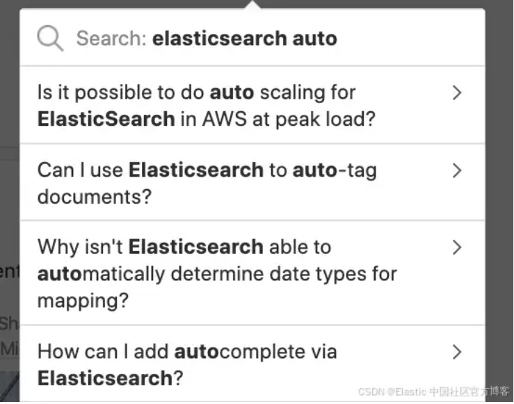 注意搜索结果中,有与 Elasticsearch 的自动扩展、自动标记和自动完成功能相关的问题。用户可以进一步输入一些字符来细化搜索结果。
