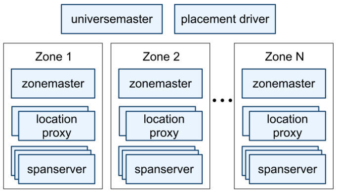 • Universe:一个 Spanner 部署被称为一个 universe。一个 Universe 下面包含多个 Zones,Zone 是 Spanner 管理、物理隔离和数据复制的基本单位。Universe 通过 universe master 组件来显示其所管理的所有 zone 的运行状态,通过 placement driver 来处理跨 Zone 的数据移动以保持数据均衡。