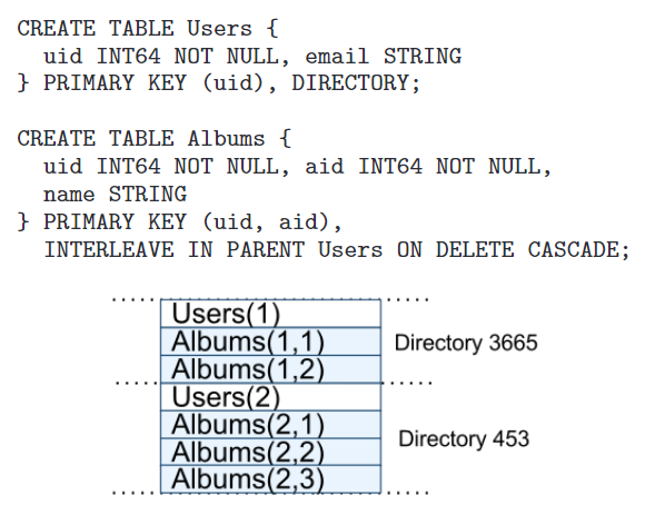 2)Spanner 表间不存在外键关系 , 而是设计了一种层级关系 hierarchy。以图 4 示例为例 , Users 表被称为 directory 表或父表 , 用 DIRECTORY 关键字表示 , 子表 Albums 与 directory 表交织(interleave),交织的表数据被保存在一起。