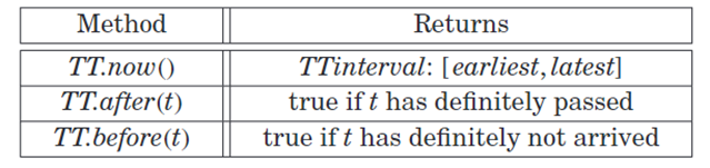 为了实现上述外部一致性,TrueTime 实现的关键特性之一是显式地暴露时钟的不确定性。它不仅提供当前时间,还提供一个时间范围,即最早可能的时间和最晚可能的时间。TrueTime 一共包含以下三种方法: