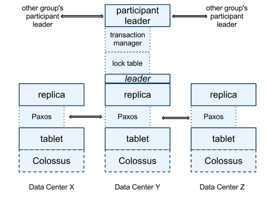 • 事务管理器用于支持分布式事务。如果一个事务只涉及一个 paxos 组, 这种情况下事务就会绕过管理器,直接基于锁表和 paxos 共识协议就可以保证事务一致性。如果一个事务涉及多个 paxos 组,这些组中的 leader 会协调执行两阶段提交。具体的,这些组中的一个组会被选定为协调者,该组中的 leader 作为协调领导者角色,该组中的 slave 副本则作为协调追随者角色。基于两阶段提交协议,在准备阶段,协调者向所有参与者发送准备请求;在提交阶段,协调者向所有参与者发送提交请求。值得一提的是,每个事务管理器状态也都存储在底层的 paxos 组中以保证状态一致性。
