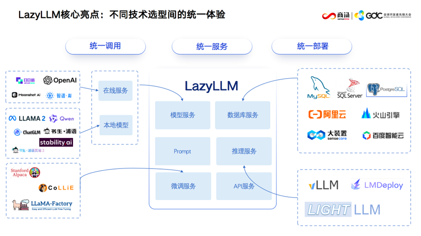 LazyLLM可以帮助你对几十到上百条数据进行微调,微调后就可以在比较小的模型和垂直场景下取得比较好的效果。对于推理服务,如果你不用API,想用自己的模型,我们自己的推理框架LIGHTLLM或者是开源的VLLM和LMDeploy我们都支持部署。