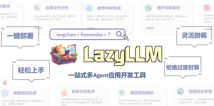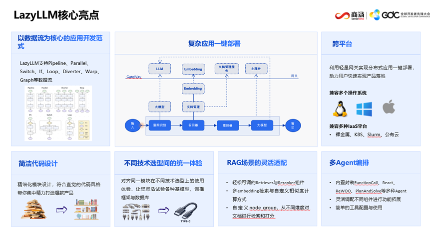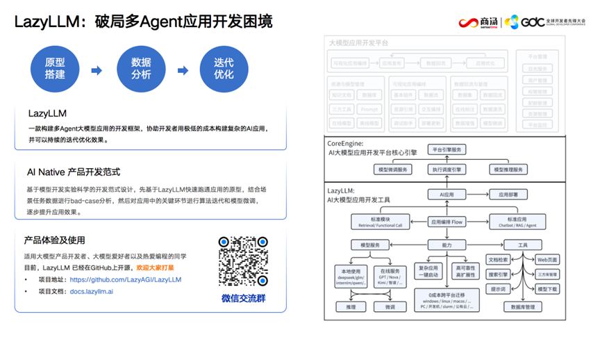 因此,我们开发了一站式多agent应用开发工具LazyLLM。商汤作为一个AI公司,大装置作为算力的服务商,我们希望算力能被大家普惠的用起来。所以从去年起,我们开始在开源社区发力,做开源工具,也就是大家今天可以用到的LazyLLM~