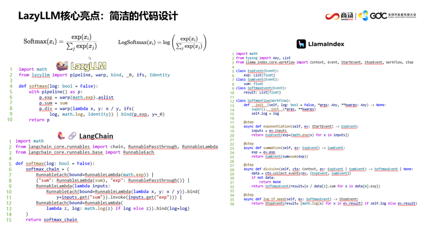代码来了!莫慌莫慌,这里只是给大家秀下肌肉——展示我们怎么做简洁代码设计。大家不用懂这里面的代码,这个例子只是告诉大家:如果实现一个数学公式,lazy大概10行不到的代码就可实现,而LangChain需要15行代码,LlamaIndex则需要30多行代码。只看行数,LazyLLM稳赢哒!我们也想低调,但是实力不允许啊~
