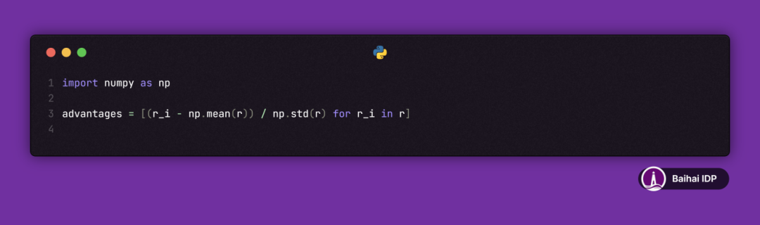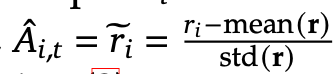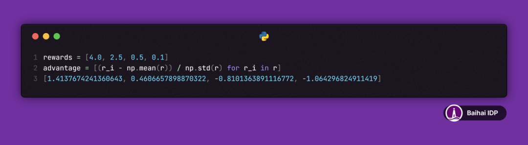 当获得所有输出的奖励值 (r) 后,GRPO 通过计算奖励值的均值 μ 和标准差 σ,生成群组相对优势 A。具体公式为: