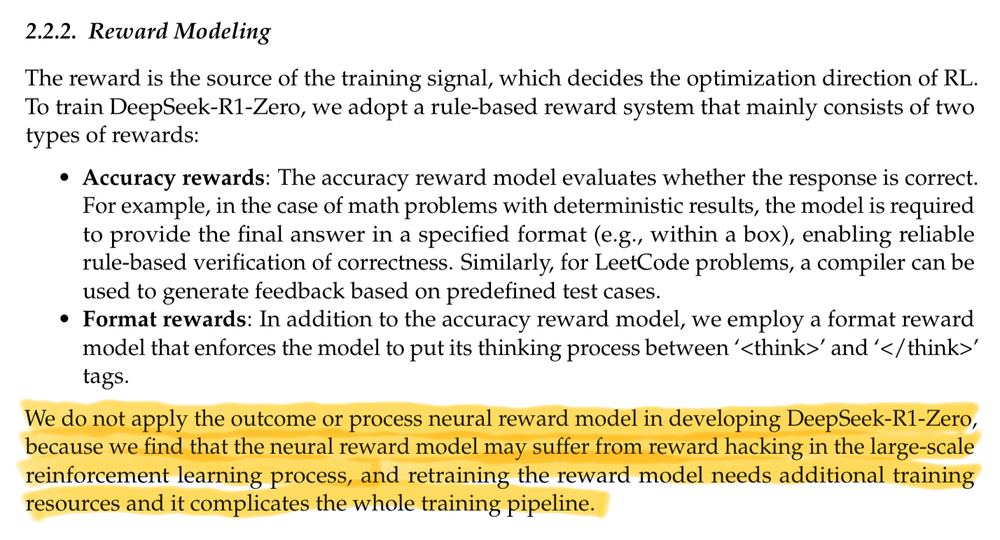 DeepSeek-R1-Zero 研究的突破性在于,他们通过完全弃用"神经奖励模型"进一步大幅降低了内存消耗。