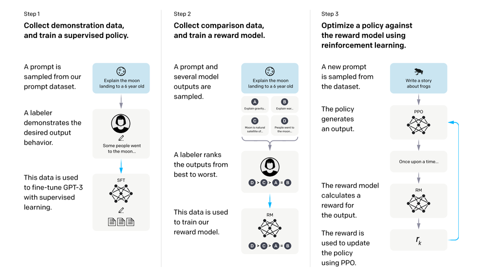 传闻 ChatGPT 背后的强化学习(RL)技术是 PPO(Proximal Policy Optimization,近端策略优化)。该流程在 InstructGPT 论文[3]中被提出,用于创建能够遵循指令而不仅仅是简单预测下一个单词的模型。
