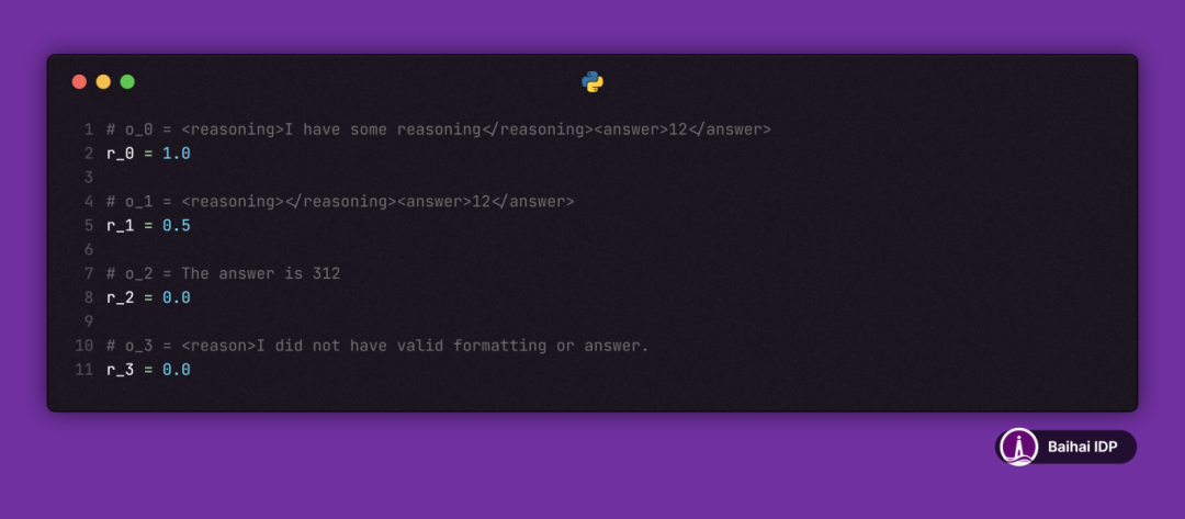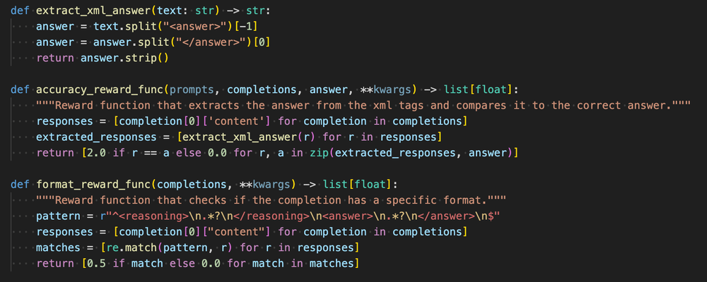 如果将前文提到的"准确性奖励(Accuracy Rewards)"和"格式奖励(Format Rewards)"规则转化为代码,其代码实现可能如下所示: