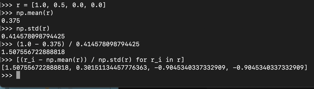 通过归一化,将奖励值转换为以均值为中心(0.0)的相对优势值。正值表示优于平均水平,负值表示劣于平均水平。这为我们建立了一套基准:"给定当前提示词,平均响应的质量如何?"在训练过程中,强化表现好的输出(提高其概率),抑制表现差的输出(降低其概率),从而引导模型优化方向。