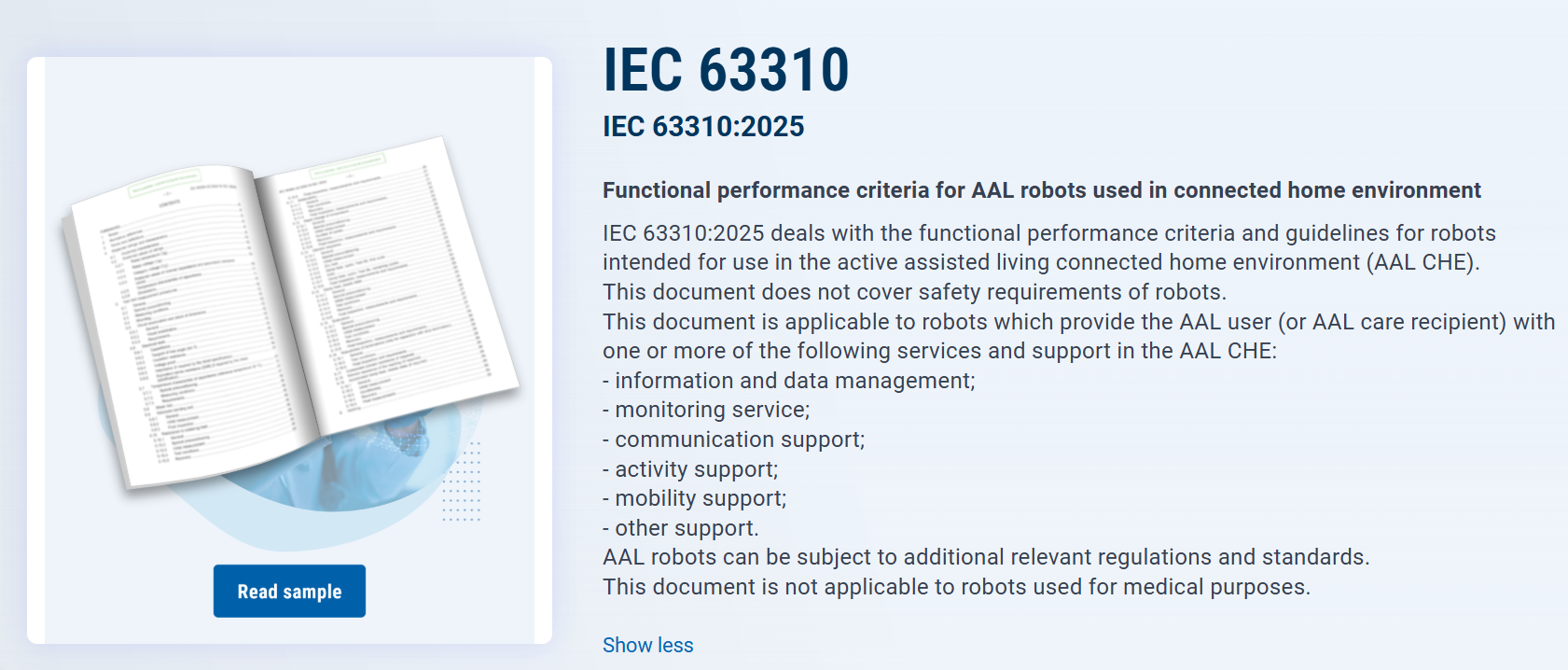 国际电工委员会(IEC)近日正式发布由我国牵头制定的养老机器人国际标准(IEC 63310《互联家庭环境下使用的主动辅助生活机器人性能准则》)。