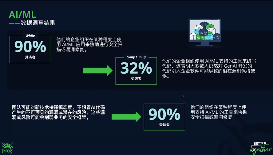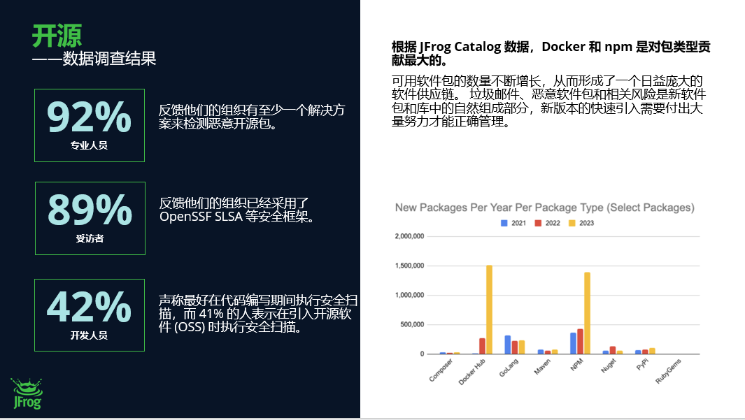 JFrog公司研究团队在全球软件供应链发展报告中指出,AI大模型不仅是前端的内容生成,还包括模型、数据集、Python脚本等在容器环境里的运行,这就需要后端软件供应链的支撑。