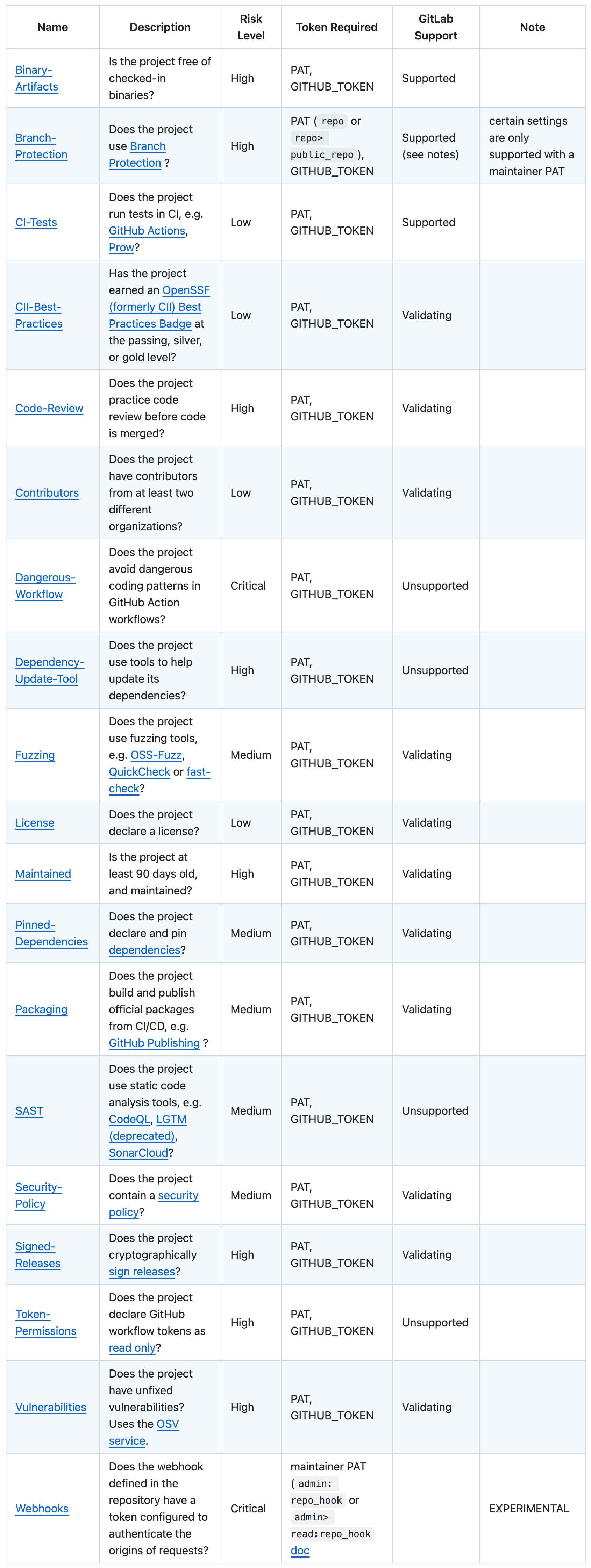 Scorecards 定义了初始评估标准,它被用于以一种完全自动化的方式为开源项目生成一个评分卡。评分卡的每项检查都可以被控制是否启用,部分评估指标包括定义良好的安全策略、代码审查流程以及使用模糊测试和静态代码分析工具的持续测试覆盖率。每项安全检查都会返回一个布尔值以及信任度分数。