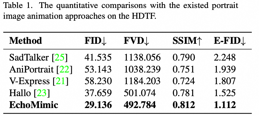 在定量指标方面,EchoMimic表现出更好的性能。这很大程度上归因于其更大的训练数据集:EchoMimic使用了540小时的数据进行训练,而Hallo仅使用了150+小时的训练数据。