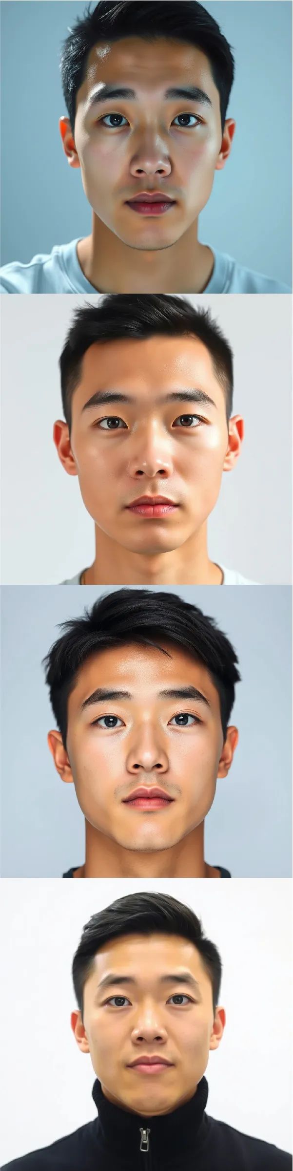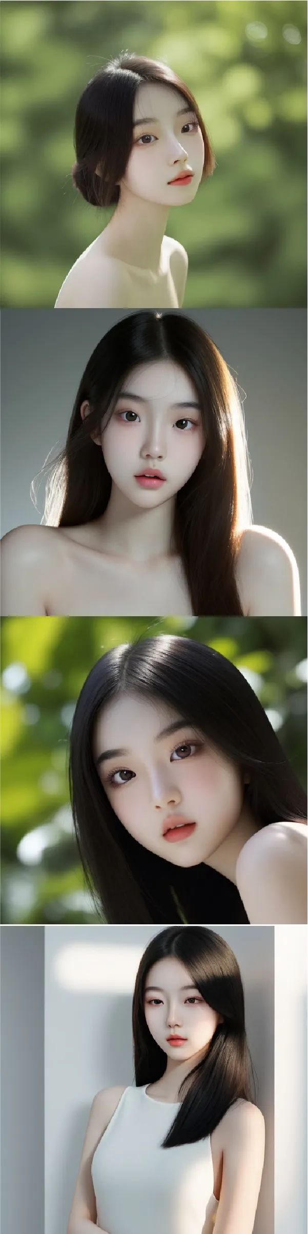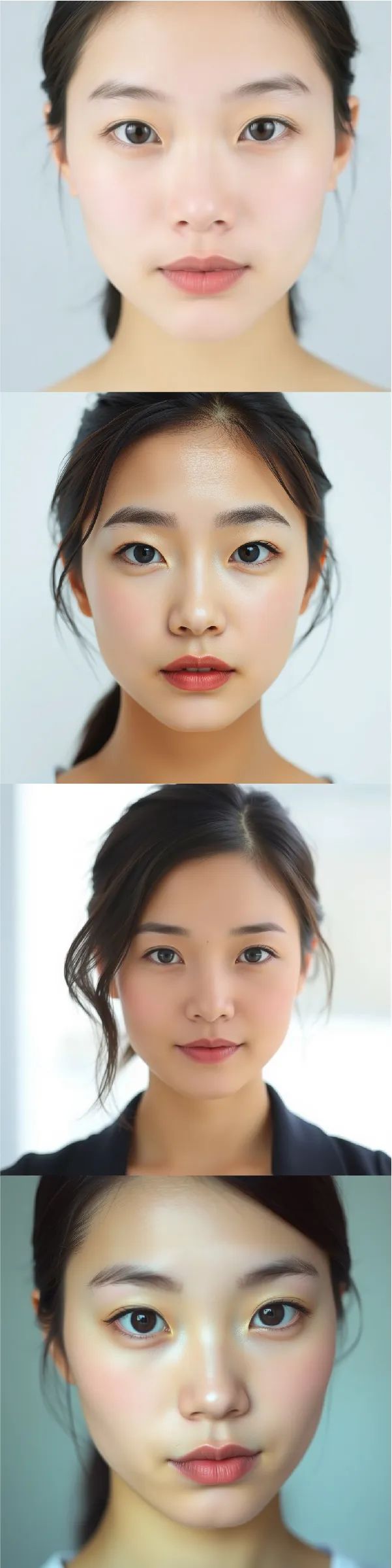 如下图所示,我们分别使用了 Flux 和 MajicMix 模型,并结合不同的 Prompt 来生成人脸图像。然而,每一列得到的人脸图片样貌过于相似,无法保证多样性。