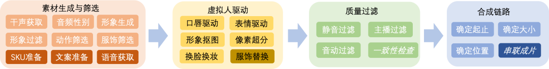 我们将整个业务流程划分为四个环节:素材生成与筛选、人物驱动、质量过滤和合成链路。这一完整的链路串联了组内多名同学的能力和贡献,是团队技术能力的一次综合体现。