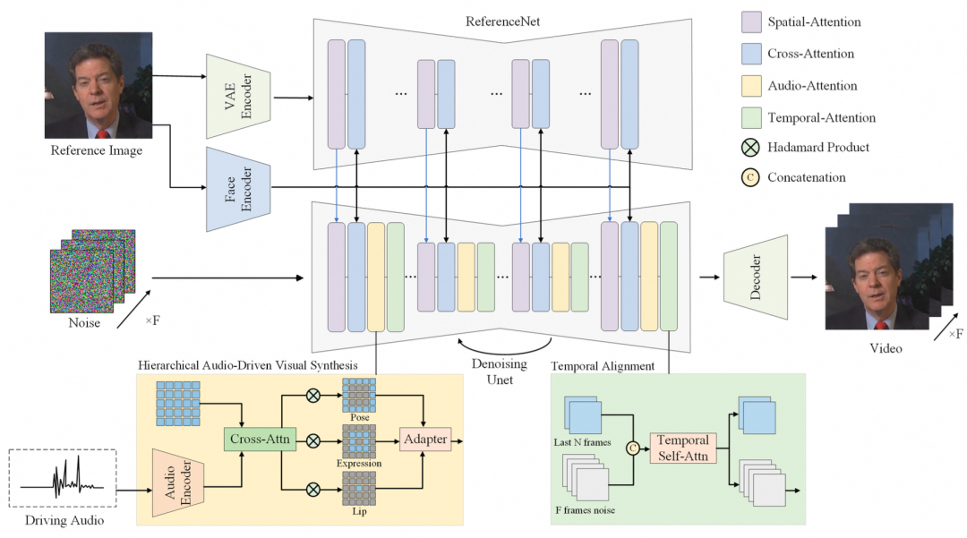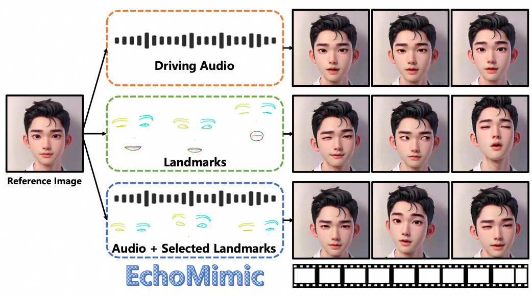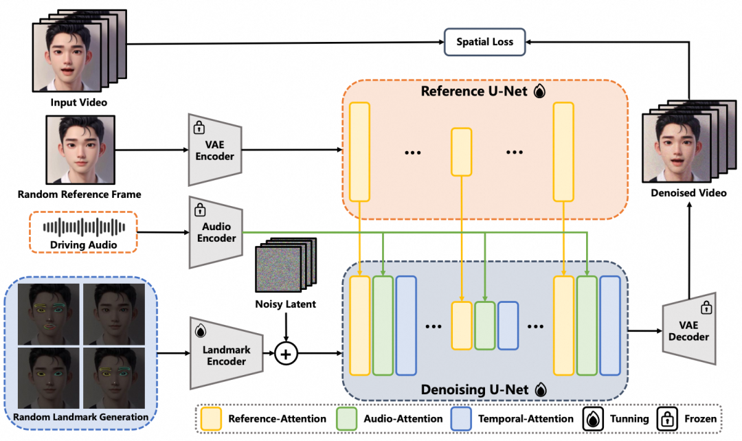 除了Hallo之外,蚂蚁集团开发的EchoMimic[4] 在网络结构上与其类似,但引入了一个关键的Landmark Encoder模块(如图所示),将人脸的关键点信息纳入模型中,从而提高了生成视频的保真度和一致性。