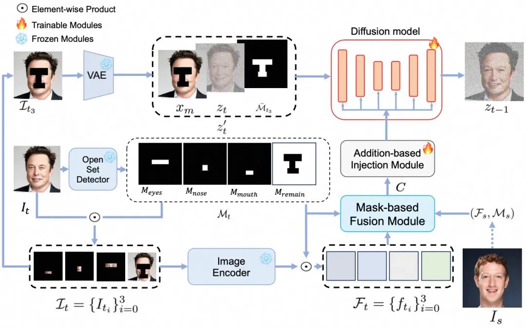 面部检测和掩码提取:首先使用一个开放集检测器识别面部图像,以获取各种面部部位(如眼睛、鼻子、嘴巴等)的掩码。