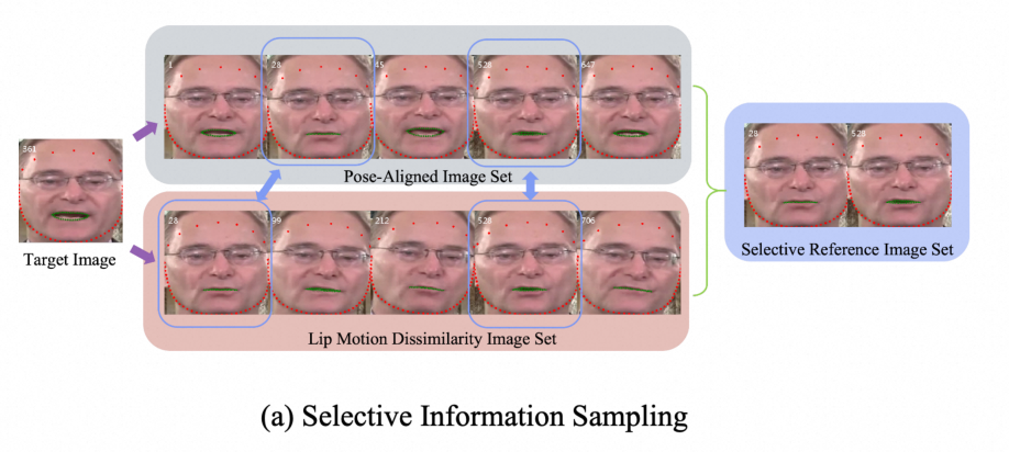 参考图片选择机制:通过 SIS 机制选择头部姿态接近但口唇差异大的样本作为参考图片,使得模型更加专注于生成高质量的口唇部分。