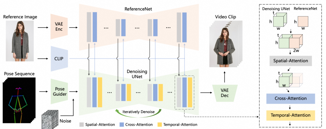 ReferenceNet 和 CLIP 图像编码器:通过 ReferenceNet 保持人物外观的一致性,并引入 CLIP 图像编码器来嵌入身份信息。来自 ReferenceNet 的层级特征与 Denoising UNet 中对应的特征进行融合,以确保生成的视频帧具有稳定的视觉风格。 -