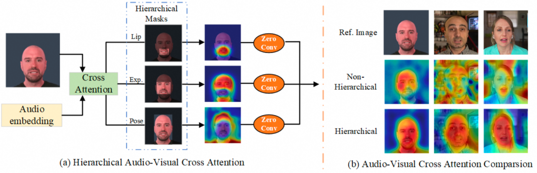 值得一提的是,Hallo引入了层级音频-视觉交叉注意力模块(Hierarchical Audio-Visual Cross Attention)来增强语音特征和特定面部位置之间的一致性,具体结构如下图所示: