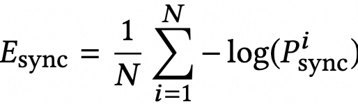 然而,由于口唇区域在整个脸部所占的比例很小(约 4%),重建损失对口唇部分的影响相对较小;同时,GAN 的主要目标是生成逼真的图像,而不是专注于特定细节的同步度。因此,Wav2Lip 引入了一种称为同步损失(Sync Loss)的技术,并在此基础上加入了时间约束。