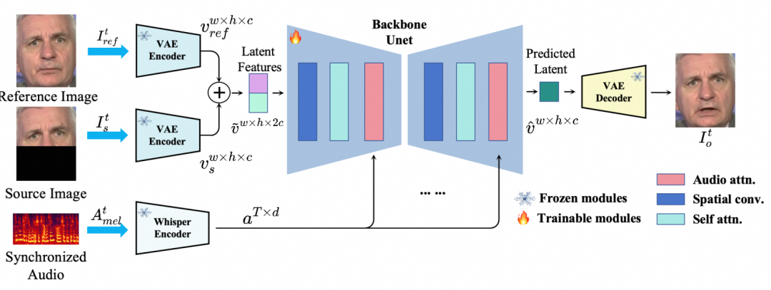 首先,将一个参考人脸图像与遮挡下半部分的目标图像通过变分自编码器(VAE)进行编码,生成潜在空间中的特征表示,并将其拼接后作为 UNet 模型的输入。对于驱动音频,在时刻