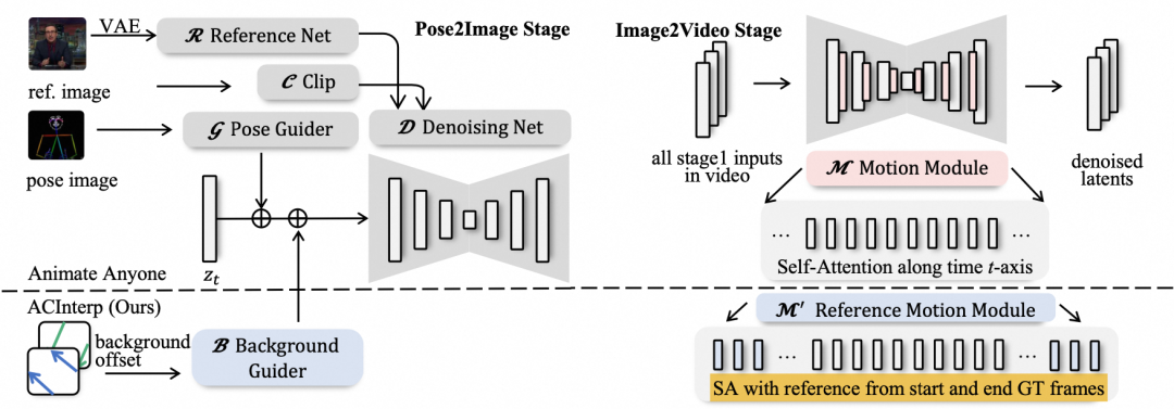 采样得到的路径通常包含许多跳变,因此需要使用一个插帧模型来填补缺失的帧,从而生成连贯的视频。Tango 采用了基于 AnimateAnyone 的方法来进行视频插帧。如图所示,与 AnimateAnyone 不同的是,Tango 引入了 Background Guider 模块,并修改了 Motion Module 部分。通过这些改进,Tango 能够更好地处理背景和动作细节,从而生成更自然、连贯的视频。