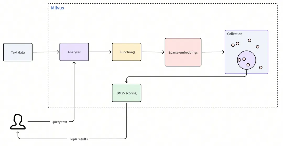 内置分词器,无需额外预处理:通过内置分词器(Analyzer)与稀疏向量提取能力, 可直接接受文本输入,自动完成分词、停用词过滤与稀疏向量提取,无需依赖外部模型(如BGE-M3等)。