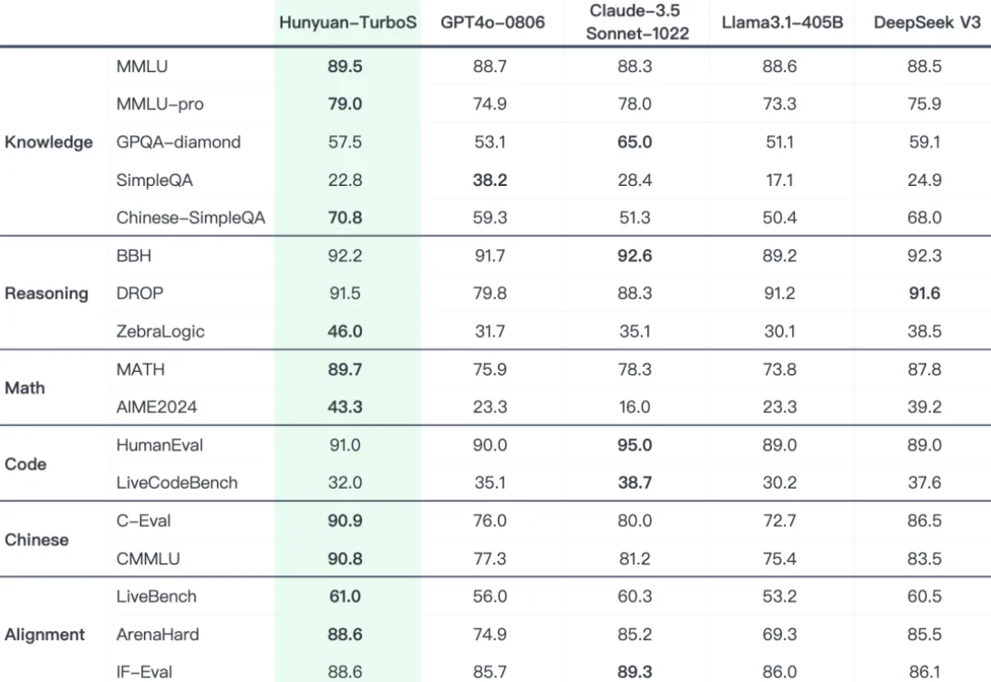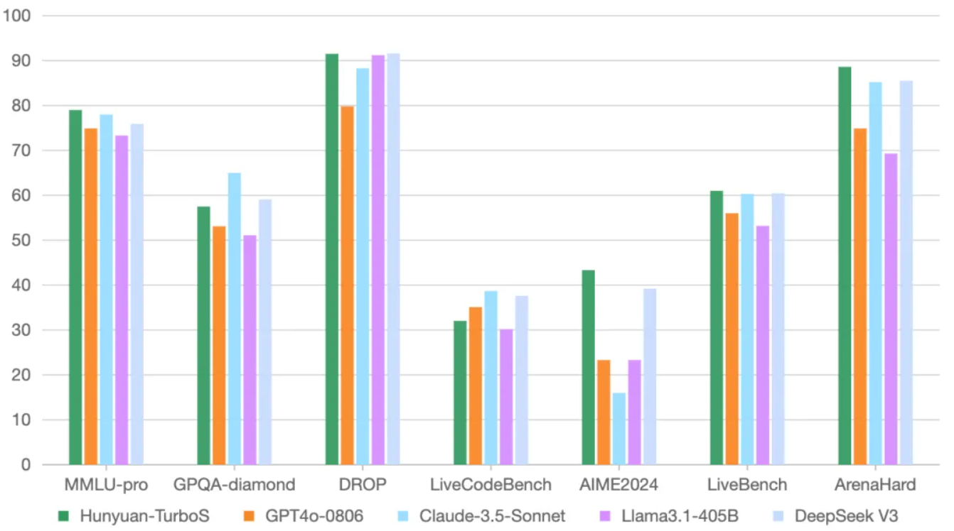 在业界通用的多个公开 Benchmark 上,混元 Turbo S 在知识、数学、推理等多个领域,展现出对标 DeepSeek V3、GPT 4o、Claude等一系列业界领先模型的效果表现。