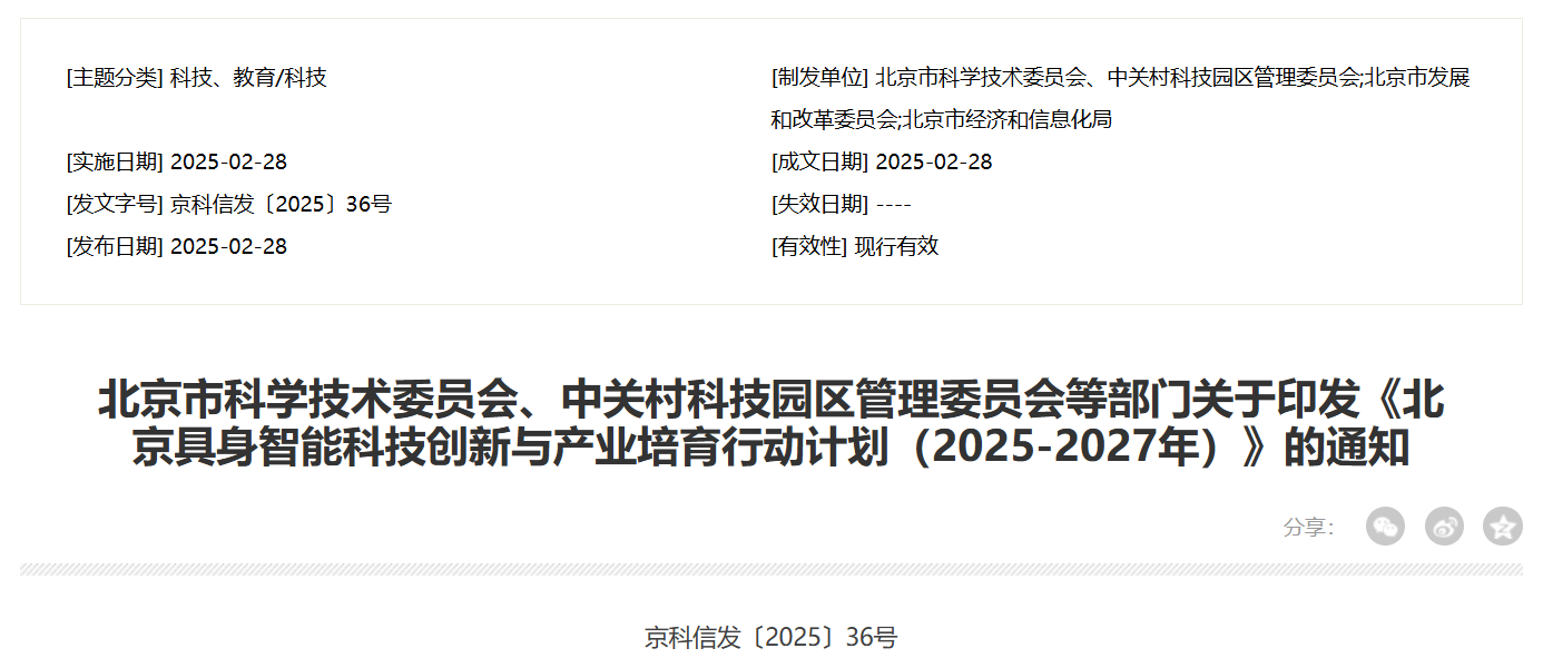北京市科学技术委员会、中关村科技园区管理委员会等部门印发《北京具身智能科技创新与产业培育行动计划(2025-2027年)》。