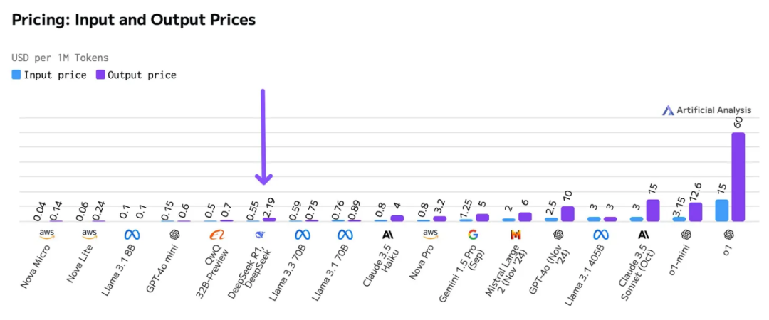 用最悲观的视角看,头部 AI 实验室正在为全球提供免费的外包研发和资本支出服务。以定价为例:OpenAI 的 o1 模型收费高达 15 美元/百万input token 和 60 美元/百万output token,而 DeepSeek R1 模型的对应成本仅为 0.14 美元/百万 input token 和2.19美元/百万output token ------ 相差了好几个数量级。